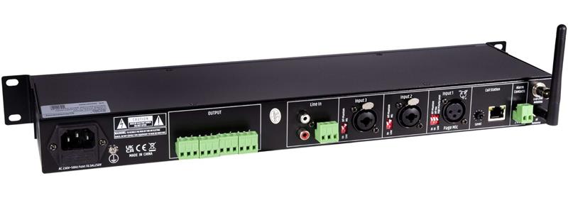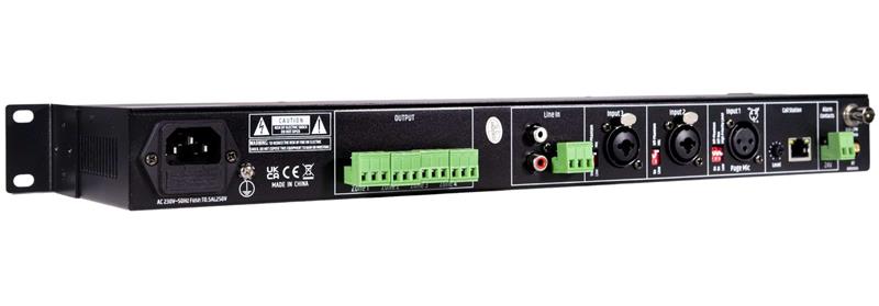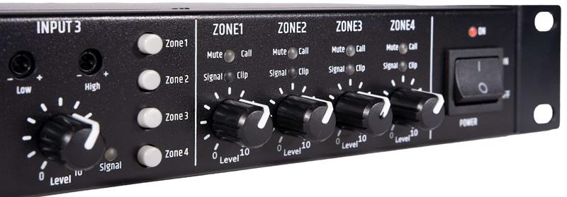 • 4 sorties zones chacune avec vumètre du niveau de sortie et réglage de volume